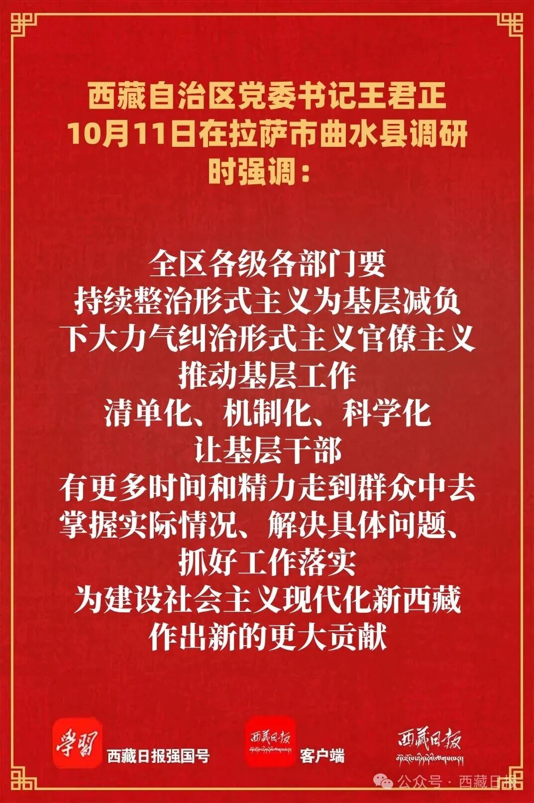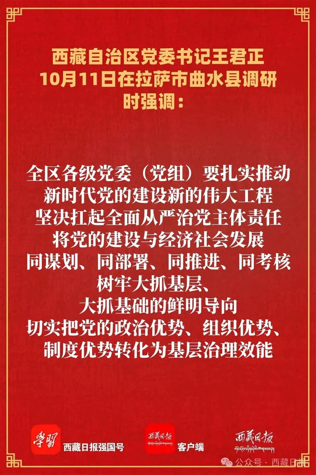 10月11日,自治区党委书记王君正前往拉萨市曲水县,宣讲习近平总书记视察西藏时的重要讲话精神并调研基层党建工作。强调,要深入贯彻习近平总书记关于党的建设的重要思想、关于西藏工作的重要指示和新时代党的治藏方略,认真落实习近平总书记视察西藏时的重要讲话精神,加强党的建设,充分发挥基层党组织战斗堡垒作用,不断打牢党在西藏的执政基础,为社会主义现代化新西藏建设提供坚强组织保障。