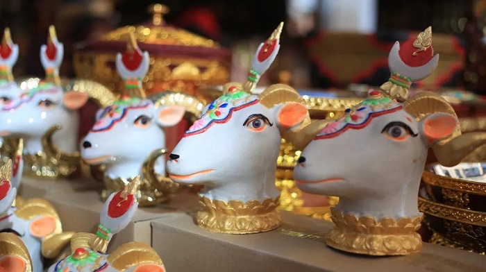 在西藏,过年时也会把羊头摆在“德嘎”旁边,之所以在新年时摆上桌有两种说法:一是羊头在藏语中叫“洛果”,与藏语中的“年头”一词谐音,因而就成了新年物品。