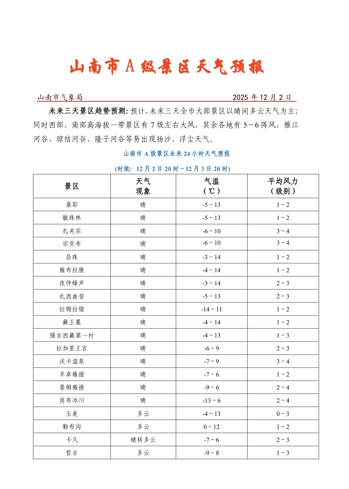 山南市A级景区天气预报
