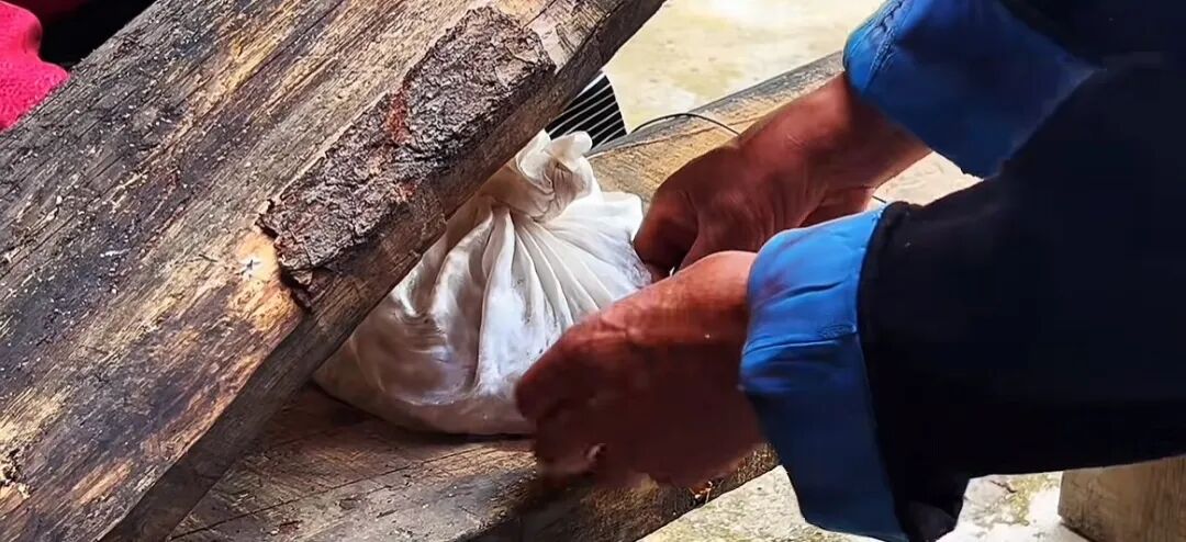 榨油则要用祖传的实木榨机,将核桃碎仁裹进棉布袋,