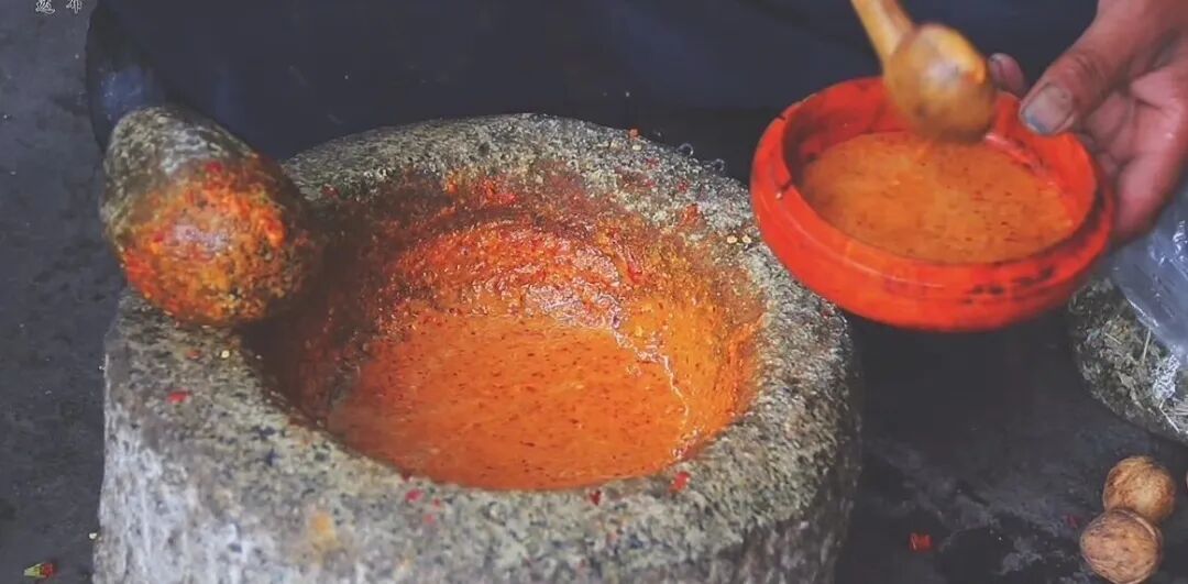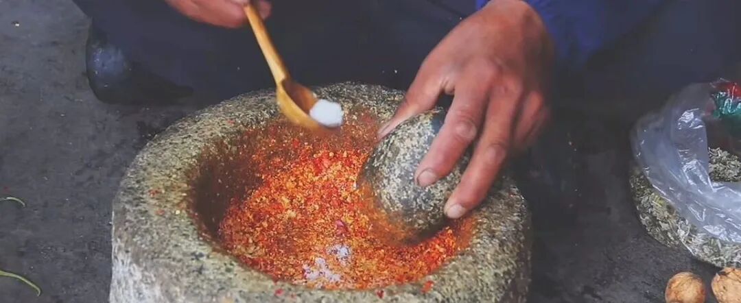 正在上演:加查本地的红辣椒晒得干瘪,被石杵捶出辛辣香气;
