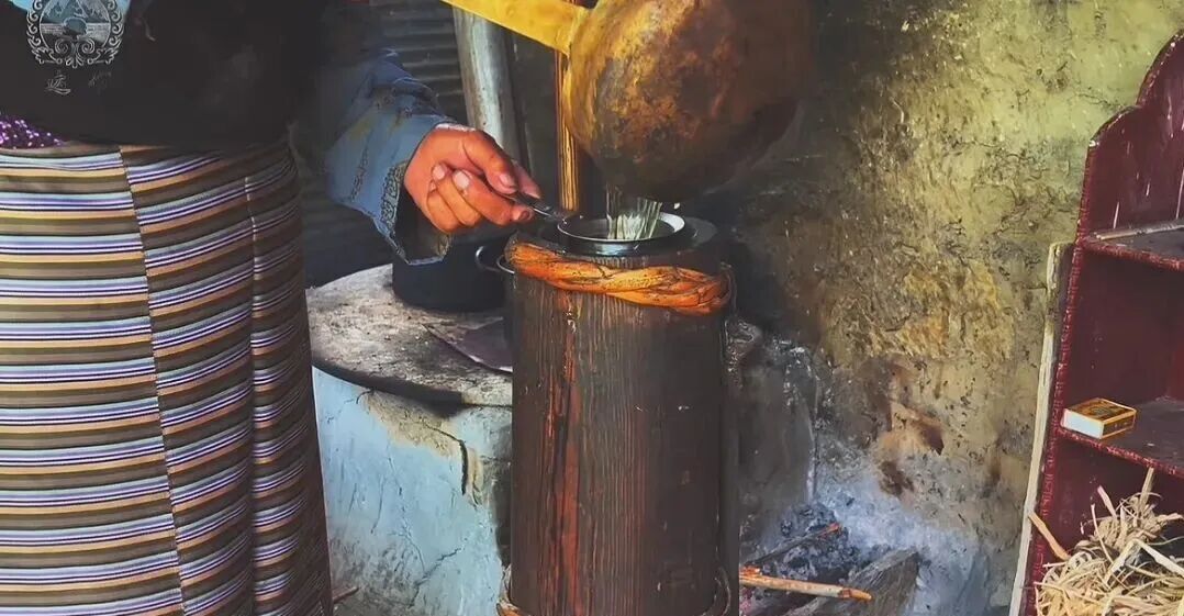 一勺酥油和少许盐,最后插入长木杵,双手握住杵柄上下来回提打——
