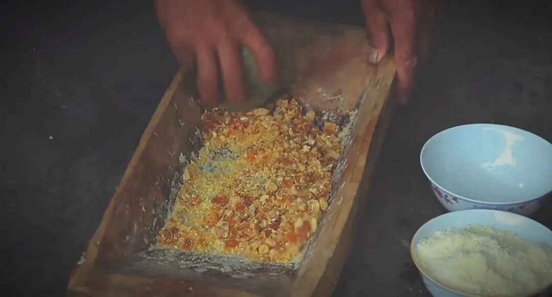 用石杵反复捣成细碎颗粒,保留些许嚼劲才够味。
