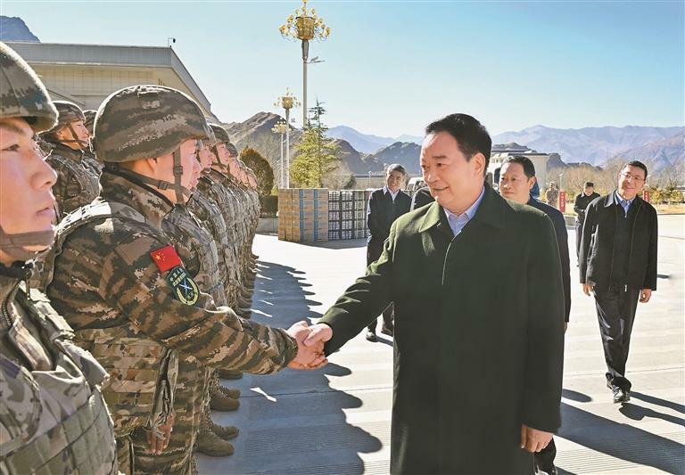 王君正强调,2026年是“十五五”开局之年,希望驻藏部队和武警官兵认真贯彻落实习近平强军思想和新时代军事战略方针,坚持党对人民军队的绝对领导,持续深化政治整训,加快先进战斗力建设,着力推进军民融合深度发展,践行人民军队根本宗旨,发扬优良传统,大力弘扬老西藏精神、“两路”精神,积极服务“四件大事”,争取更大光荣,为西藏长治久安和高质量发展作出新贡献。全区各级各部门要牢固树立国防意识和全局观念,更好支持国防和军队现代化建设,持续做好拥军优属服务保障工作,让大家“不为后路担心、不为后院分心、不为后代忧心”,始终做人民军队的坚强后盾和可靠后方。