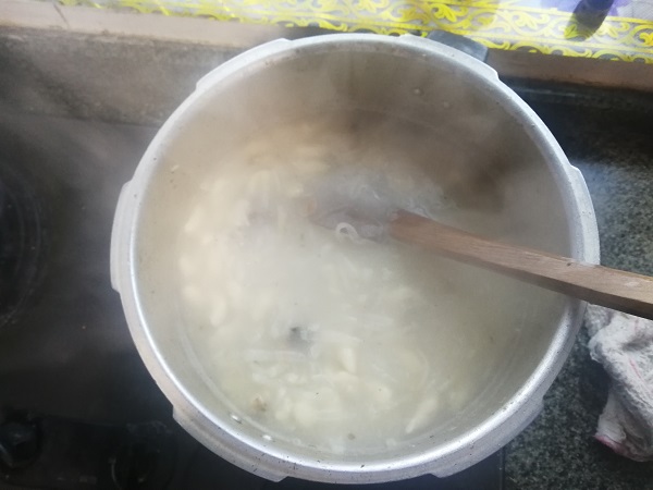 组合烹煮:将萝卜丝加入炖好的排骨汤中,煮沸后放入面疙瘩,加盖继续烹煮5至10分钟。